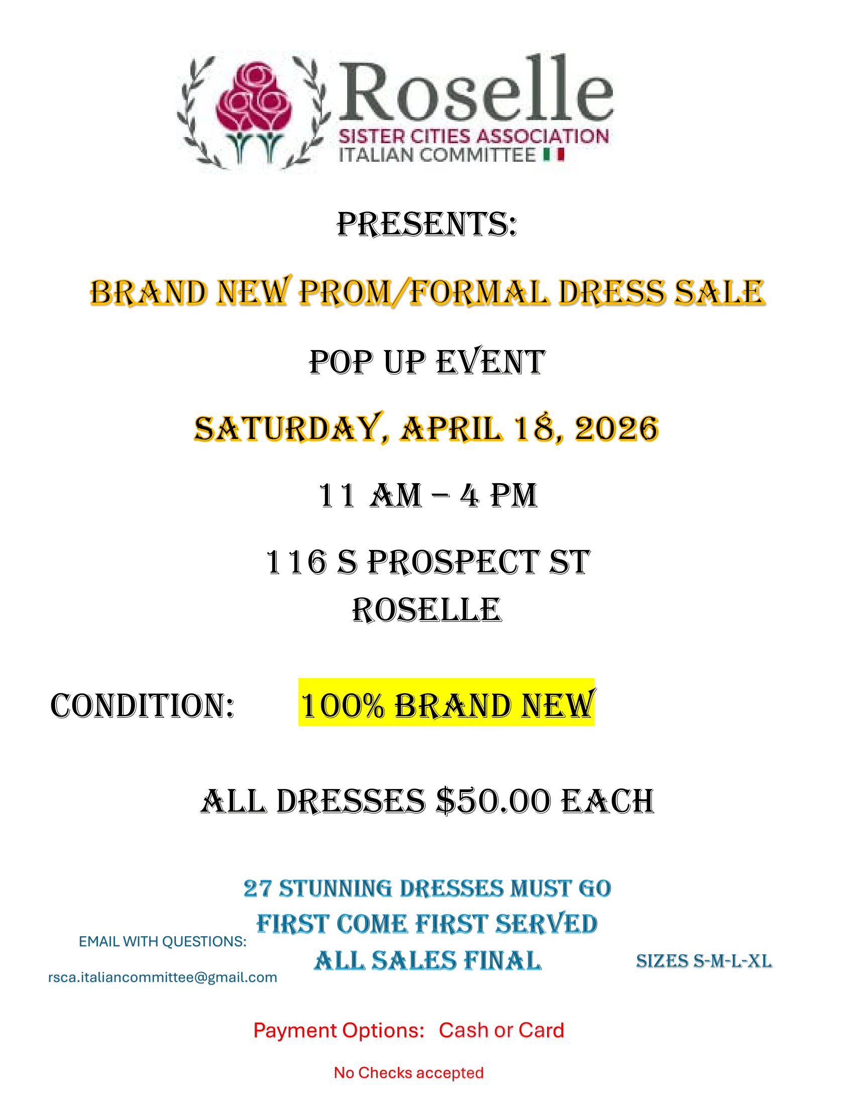 Need a dress for Prom... your Quinceañera... your Sorority Formal? The Roselle Sister Cities Association Italian Committee has 27 BEAUTIFUL AND BRAND-NEW dresses! Only $50 each so they won't last long! Try yours on at Happy By Chocolate / Roselle Fine Art Academy (116 S Prospect Street) on Saturday, April 18 from 11:00-4:00.